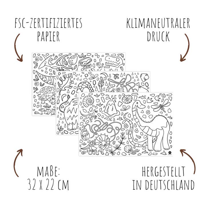 Auf in die Vergangenheit! Unsere Platzsets „Dino“ bieten eine aufregende Reise in die Welt der Dinosaurier. Dieses Set aus 12 Platzdeckchen zeigt verschiedene urzeitliche Dinosaurier und Steinzeitbewohner, die darauf warten, von kleinen Künstlern farbenfroh ausgemalt zu werden. Mit zusätzlichen Rätseln zum Knobeln wird der Ausmalspass riesig sein. Ideal für Kindergeburtstage oder als kreatives Geschenk für die Schultüte.