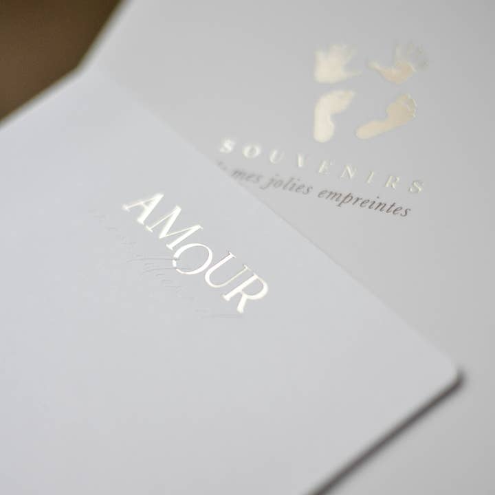 Die Karten bestehen aus hochwertigem weissen Papier mit einem Gewicht von 400 g/m² und sind mit edler Heissfolienprägung verziert. Diese Karten bieten eine luxuriöse und langlebige Basis für die Abdrücke deines Babys.