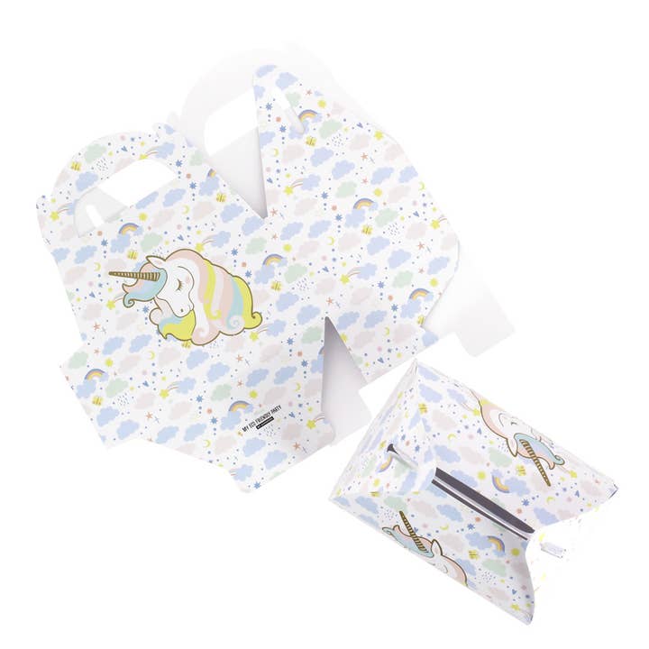 Ein Set von 3 recycelbaren Geschenkboxen aus Papier, dekoriert mit einem Einhorn-Motiv, um kleine Überraschungen und Leckereien hineinzulegen und an die Gäste zu verteilen. Stelle sie auf den Tisch oder das Buffet und ergänze sie mit weiteren ökologisch verantwortungsvollen Dekorationen aus der Kollektion für eine fantastische Einhorn-Geburtstagsparty!