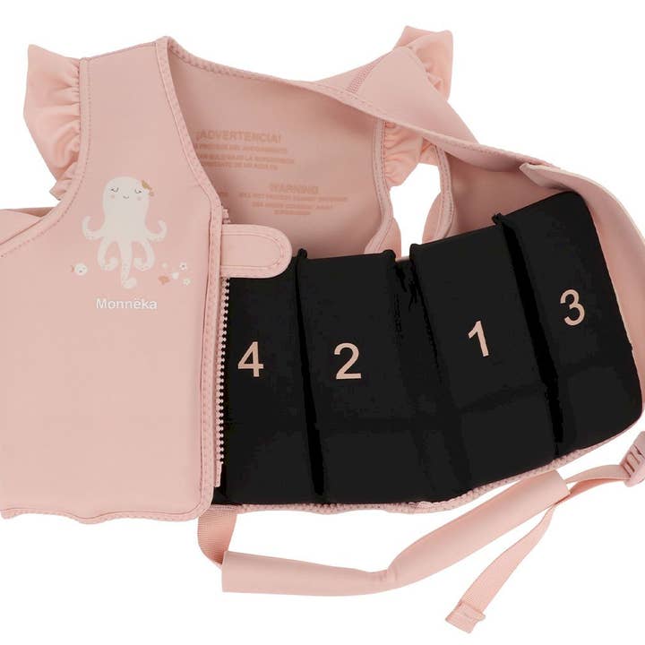 Der Weste hat 8 Fächer, die jeweils 3 Schwimmelemente enthalten, insgesamt also 24. Diese Schwimmelemente können nach und nach entfernt werden, um die Schwimmfähigkeiten des Kindes zu verbessern. Im Gegensatz zu anderen Schwimmwesten, die nur 8 Stück haben, ermöglicht diese schrittweise Anpassung eine sanftere Reduktion der Schwimmhilfe.